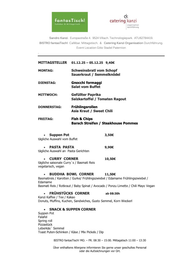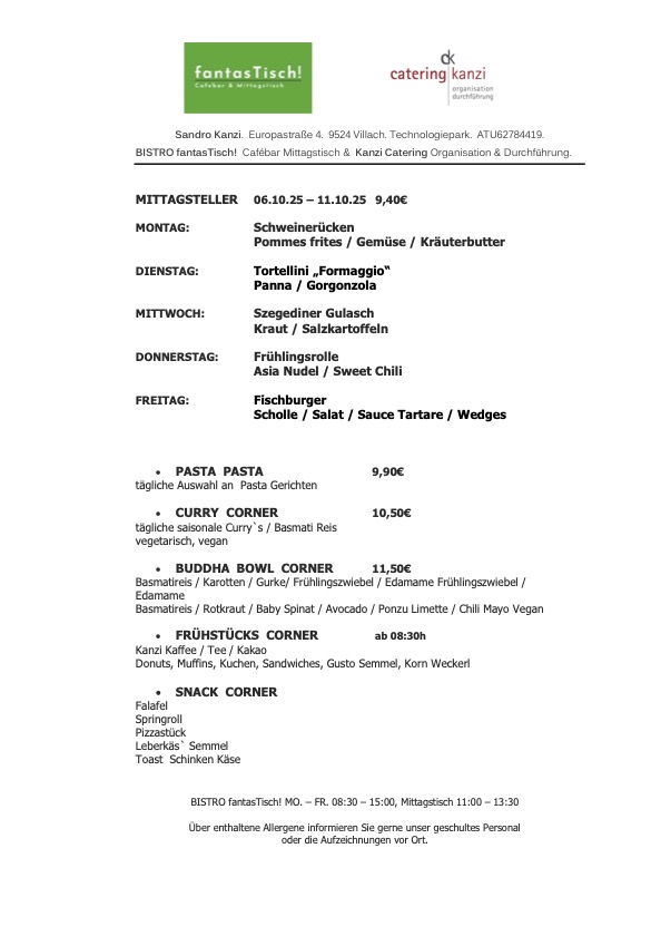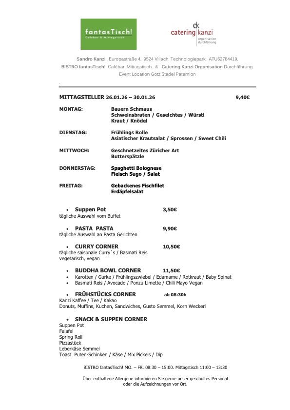 Das Restaurant FantasTisch hat unter der Woche von 9:00 bis 15:00 Uhr geöffnet, die wöchentlich wechselnden Mittagsmenüs gibt es ebenfalls von Montag bis Freitag in der Zeit von 11:00 bis 13:30 Uhr.