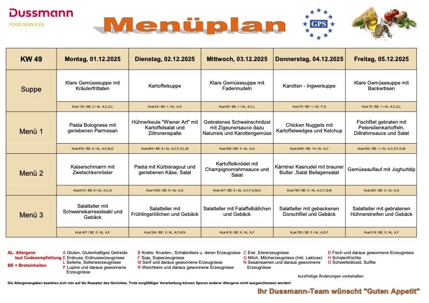 In der KW 49 (01-07.12.2025) erwarten Sie folgende Mittagsteller im tpv: