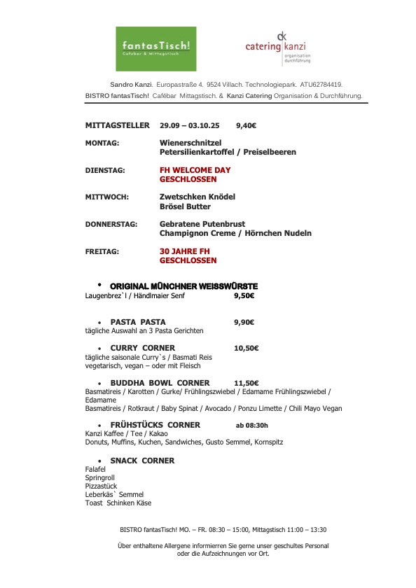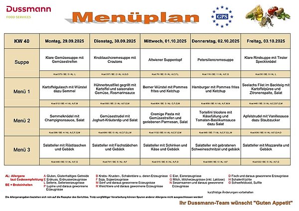 In calendar week 40 (September 29th-October 5th 2025) the following lunch dishes await you there: