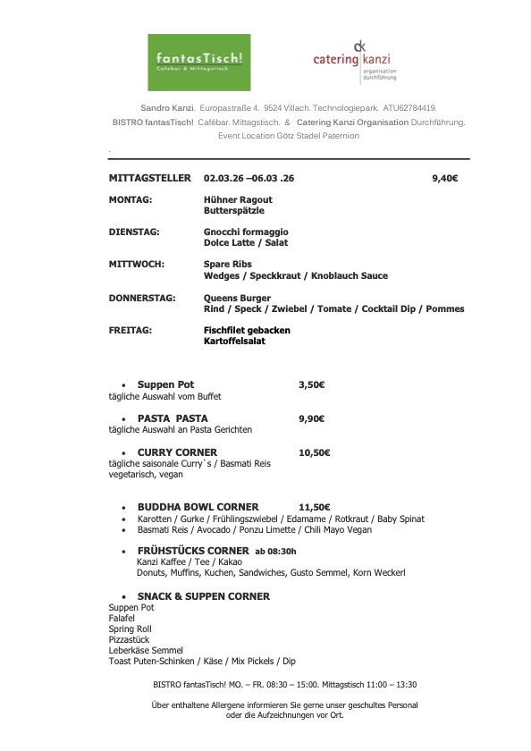 Das Restaurant FantasTisch hat unter der Woche von 9:00 bis 15:00 Uhr geöffnet, die wöchentlich wechselnden Mittagsmenüs gibt es ebenfalls von Montag bis Freitag in der Zeit von 11:00 bis 13:30 Uhr.